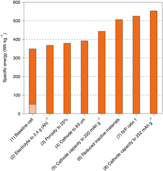 作者選擇高鎳NMC(LiNixM1- xO2,M = Mn,Co;x≥0.6)作為正極,容量大于200mAh/g,工作電壓約3.8 V。基于Li ||高鎳NMC(> 1 Ah)軟包電池分析了所需的電池關(guān)鍵參數(shù)。為了將最佳材料特性與最佳電池設(shè)計參數(shù)相結(jié)合,以獲得高達(dá)500Wh/kg的能量密度,作者在不同情景下繪制了電池能量密度柱狀圖,以說明達(dá)到不同目標(biāo)能量密度的可行途徑(圖1)。圖1:根據(jù)不同設(shè)計參數(shù)計算的電池能量密度。(1)以材料NMC622為基準(zhǔn),其具有196mAh/g比容量(在4.6V截止電壓下),35%正極孔隙率,22.0mg/cm2正極質(zhì)量負(fù)載和70μm正極厚度。N/P比為2.6,電解液容量比為3.0g/(Ah)?;鶞?zhǔn)電池中的淺陰影區(qū)域表示遠(yuǎn)小于50Wh/kg 能量密度的扣式電池的情況(2)將電解液(電解液與容量比)的量減少到2.4g/(Ah)。(3)將正極孔隙率降低至25%,從而進(jìn)一步將電解液量減少至2.1g/(Ah)。(4)將正極厚度增加到83μm并且將質(zhì)量負(fù)載增加到26.0mg/cm2。(5)將正極容量增加到220mAh/g。(6)減少非活性材料(集流體,包裝)50%以上。(7)將N/P比降低至1。(8)使用容量遠(yuǎn)高于250mAh/g的新正極材料。