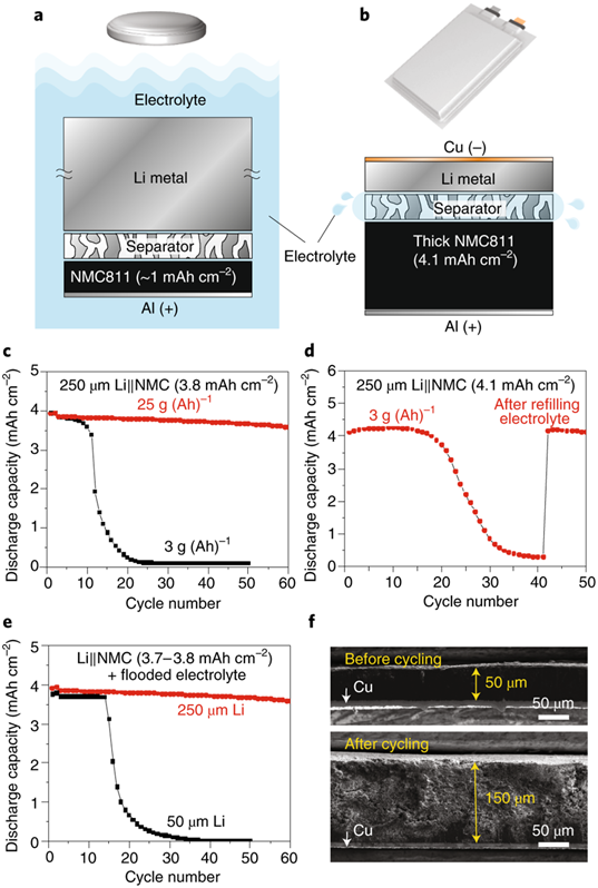 我們平時研究Li金屬電極時使用了成倍過量的鋰金屬和電解液,所得大多數(shù)研究結(jié)果中不能被放大應(yīng)用到實(shí)際的軟包電池中。對于以往研究的大多數(shù)可充放電扣式電池,其能量密度遠(yuǎn)小于50Wh/kg。如圖2所示,關(guān)鍵電池參數(shù),包括正極負(fù)載,電解液量和Li金屬量(厚度)都對電池循環(huán)性能有重要影響。除了其他非活性材料(如隔膜,集流體和包裝材料)外,還必須仔細(xì)選擇這些參數(shù),以獲得長循環(huán)高能實(shí)用電池。圖2:電池參數(shù)和電池壽命與Li負(fù)極形態(tài)之間的關(guān)系。a,實(shí)驗(yàn)室扣式電池經(jīng)常使用成倍過量的Li和電解液。b,具有多層堆疊電極的高能軟包電池。c-e,具有不同電解液用量(c)的Li || NMC電池的循環(huán)性能,在原始貧電解液被消耗(d)之后補(bǔ)充電解液,電池的循環(huán)性能;不同厚度Li金屬(e)的Li || NMC電池的循環(huán)性能。紅色線代表軟包電池,黑色線代表扣式電池。f,循環(huán)后,Li金屬負(fù)極的厚度變化,開始采用的是厚度為50微米的Li。用于c-e的扣式電池在C/10倍率下循環(huán)2次進(jìn)行化成,然后在2.7-4.4V的電壓范圍內(nèi)以C/3倍率循環(huán)進(jìn)行充放電循環(huán)。