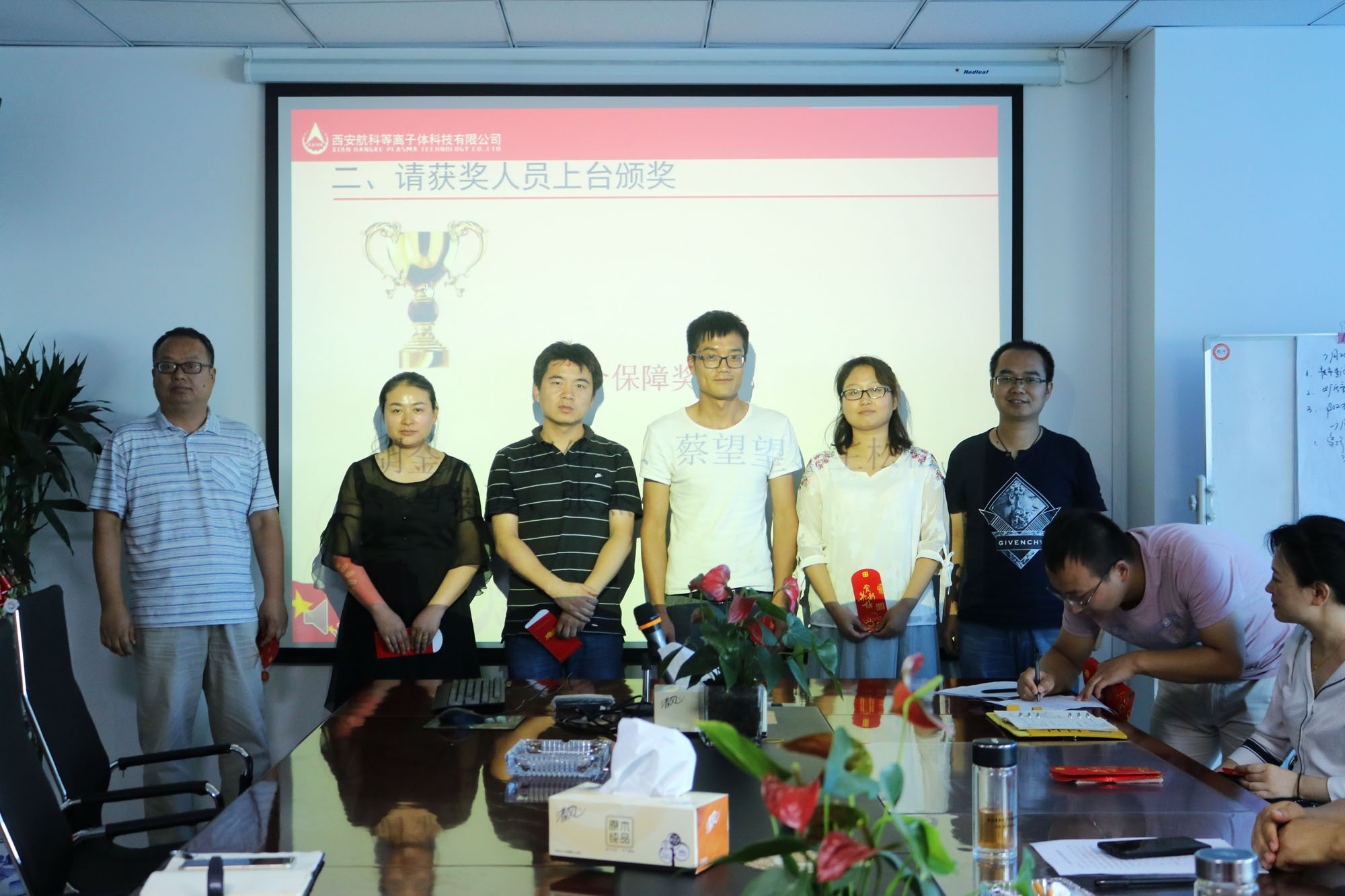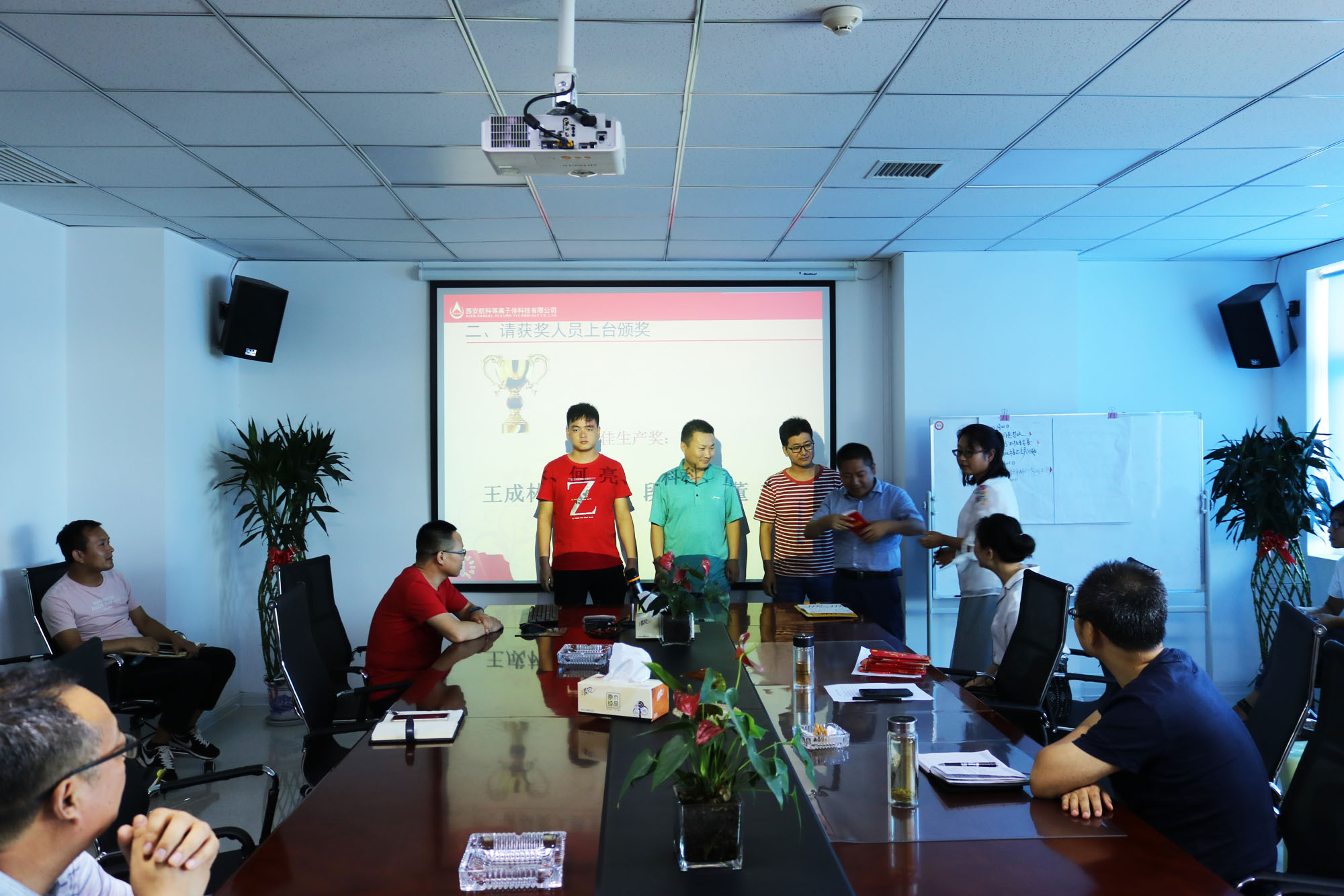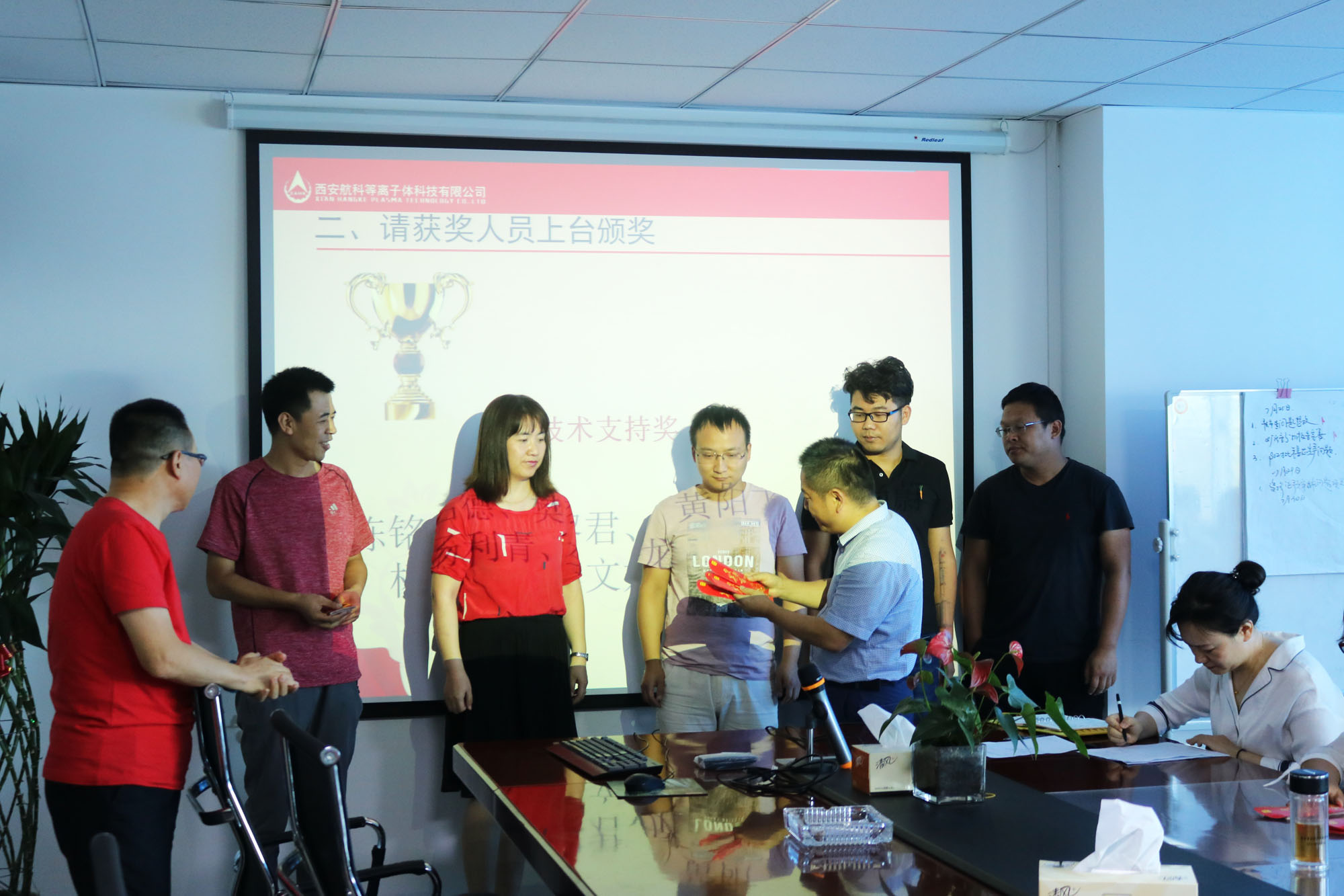 總工程師兼副總經(jīng)理馬俊與楊副總對(duì)獲獎(jiǎng)員工進(jìn)行頒獎(jiǎng)。