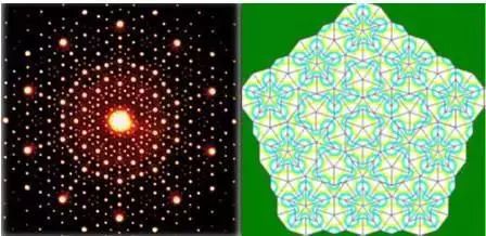 準晶,是一種介于晶體和非晶體之間的固體,它是由一位叫達尼埃爾·舍特曼的以色列物理學家發(fā)現(xiàn)的。1982年4月8日,舍特曼在觀察一種錳鋁合金的時候,發(fā)現(xiàn)在自己的電子顯微鏡上,出現(xiàn)了一種旋轉(zhuǎn)36°對稱的圖形。沒過多久,他又在合金中發(fā)現(xiàn)了一種72°旋轉(zhuǎn)對稱的圖形,類似于下面兩幅圖。