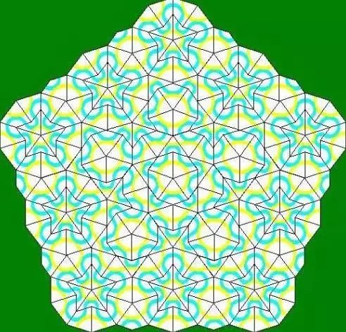 可以看出,很明顯,圖的細節(jié)上是非周期性的,它確實不像傳統(tǒng)的晶體模型,能提取一種無限重復的圖案。但是整體來看,它又具有明顯的規(guī)律性。這種由非周期性的圖案鋪滿整個平面的構(gòu)思,來自于和舍特曼同時期的英國數(shù)學家彭羅斯。如下圖中,兩種不同的圖形制成的整個平面的平鋪圖,便是大名鼎鼎的彭羅斯拼圖。彭羅斯拼圖跳出了傳統(tǒng)的正方形拼圖的觀念,巧妙地采用了一系列非周期性的磚組,構(gòu)成了一系列規(guī)則的圖案。這從數(shù)學的角度,有力地證明了準晶存在的可能性,肯定了舍特曼的工作。彭羅斯本人也獲得了1988年的沃爾夫獎,這是數(shù)學界的最高獎之一。