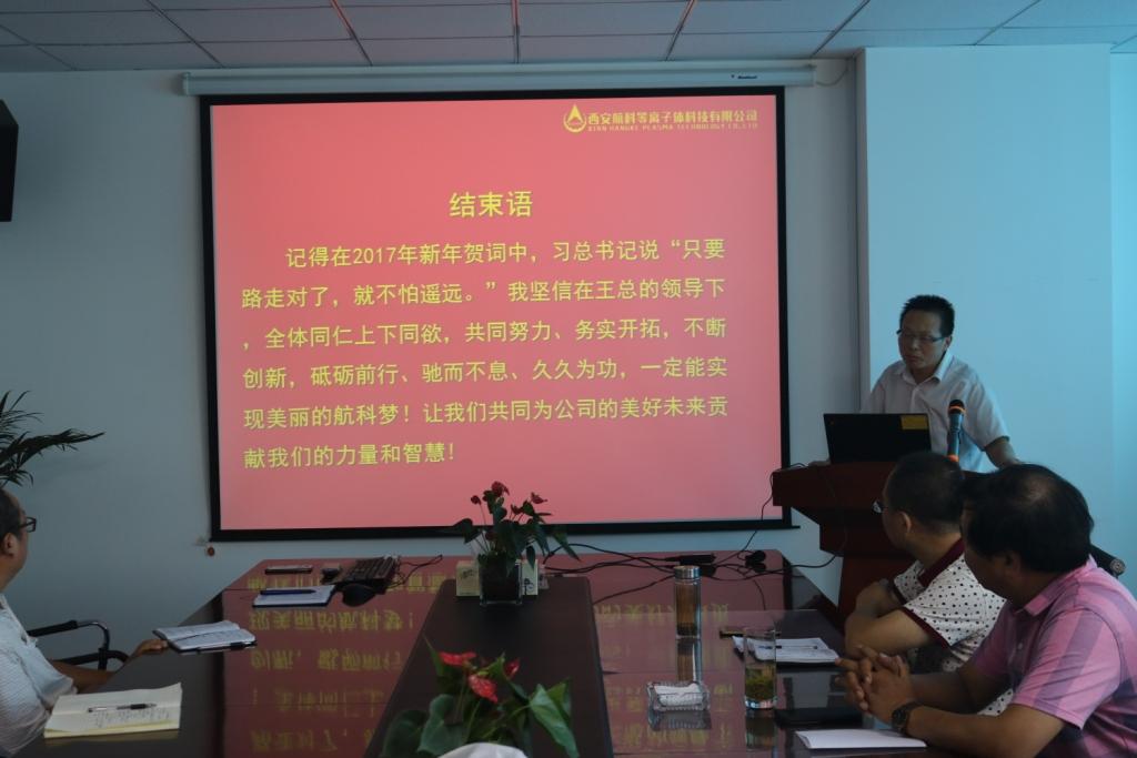 最后董事長王浩靜做了總結(jié)性的講話,他充分肯定了公司上半年所取得成績,航科人圍繞公司的“1 + 1 + 0.5”產(chǎn)品研發(fā)戰(zhàn)略,在等離子體專業(yè)領(lǐng)域取得的創(chuàng)新性的突破,實現(xiàn)國內(nèi)領(lǐng)先;其他領(lǐng)域也實現(xiàn)了大踏步的邁進,這一切離不開大家的共同努力;展望未來的152天,王總要求我們堅定公司的發(fā)展方向,快速推動軍民融合,秉持公司“創(chuàng)新一代 研發(fā)一代 儲備一代 生產(chǎn)一代 服務(wù)一代”的發(fā)展原則,做好新“2.5”,穩(wěn)步促進預(yù)研項目;上半年已經(jīng)匆匆而過,他提出一個創(chuàng)業(yè)型企業(yè)要做什么?作為我們公司,應(yīng)該快速促進技術(shù)轉(zhuǎn)化,用有限的資源,做合理的布局,爭取產(chǎn)品的市場化。他希望下半年從組織架構(gòu)和人員配備、管理制度提升、統(tǒng)一思想和優(yōu)勝劣汰、解放思想和適應(yīng)市場發(fā)展、激勵政策等方面對公司的管理進一步提升;各職能部門應(yīng)主動作為,研發(fā)人員團結(jié)協(xié)作,實現(xiàn)航科的跨越。